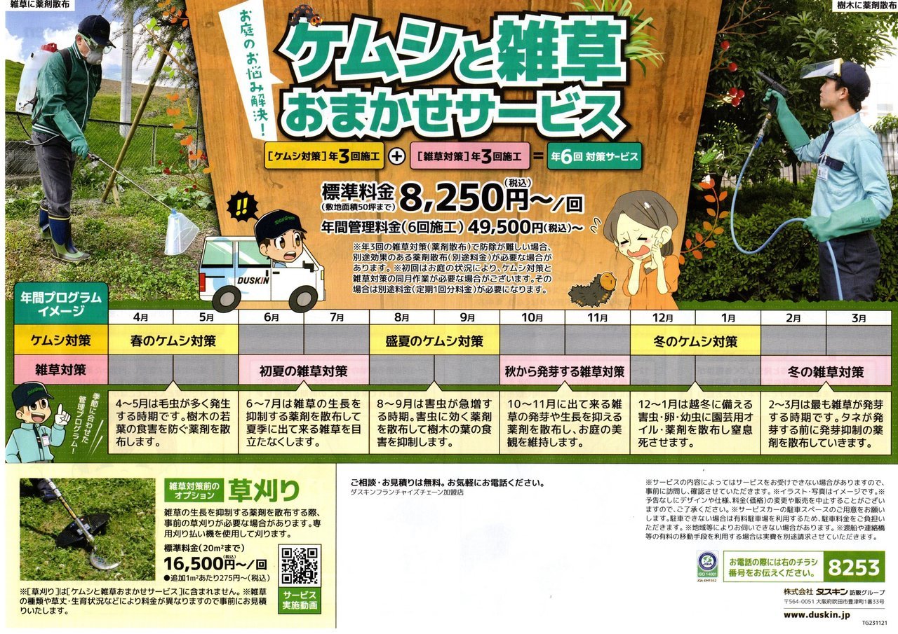 現在大変ご好評をいただいております『雑草が目立たないサービス』の内容と、『樹木の年間お手入れサービス』の肥料を除く病害虫対策の一部を抜粋して、組み合わせたサービスです。肥料はそんなに必要ないよ、というお客様で雑草対策も一緒にお考えのお客様に最適なサービスです。